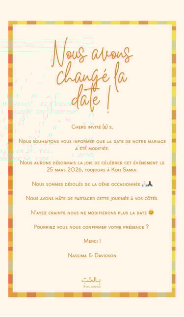 Nous sommes ravis de vous inviter à passer un moment unique tous ensemble, et partager avec vous l'aboutissement de nos préparatifs pour notre mariage.