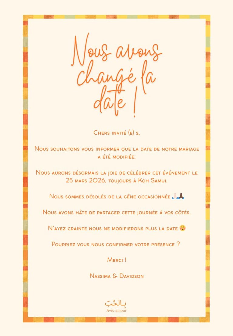 A savoir qu'il est préférable que vous arriviez le 21/03/2026, dans la mesure du possible, puisque nous prévoyons de faire des activités ensemble le WE précédant le mariage, qui se tiendra le mercredi qui suit.⁷